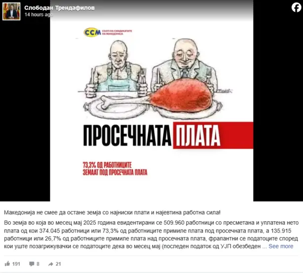 Секоја одложена реакција е директен удар врз достоинството на работниците, а воедно и врз иднината на земјата. Македонија не смее да остане земја со најевтина работна сила – работниците заслужуваат плата што ќе обезбеди пристоен и достоинствен живот!“, напиша тој.