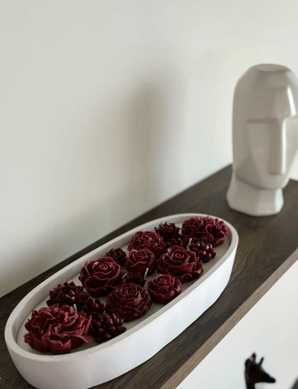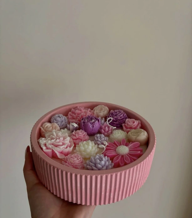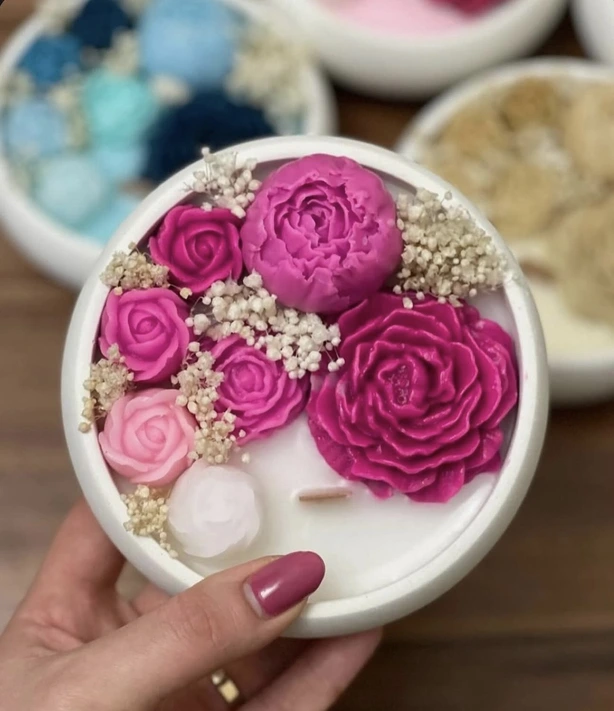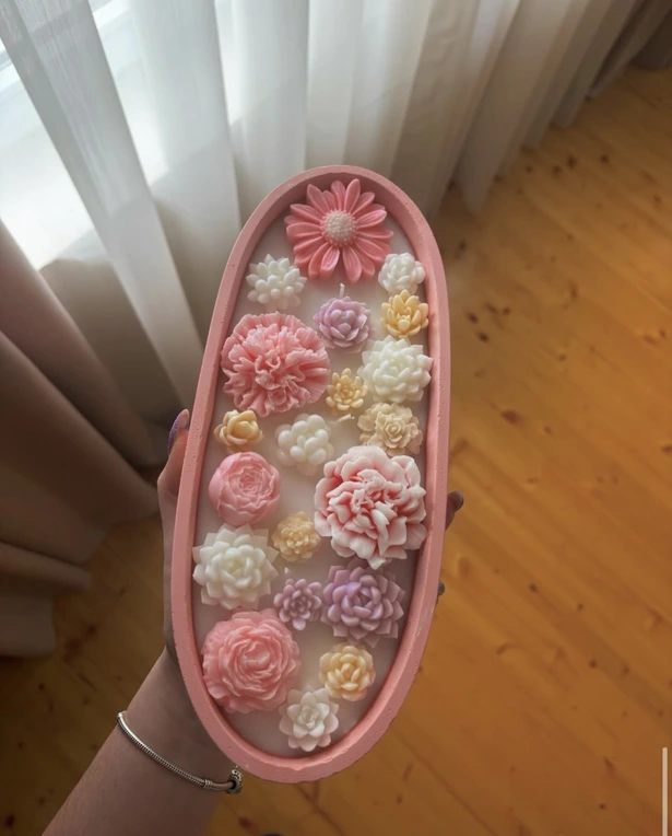 Мојата прва свеќа сè уште стои во дневната соба. Ја направив за себе, како пробна. Садот е рачна изработка, а самата свеќа ја украсив со розеви, бели и лилјакови цветови. Мирисот што го одбрав беше лаванда – мојот омилен, кој ми носи мир и спокој.