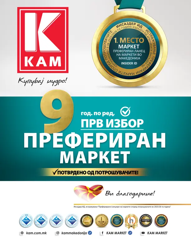 🥇 КАМ деветта година по ред е број 1 префериран ланец на маркети во Македонија за 2025/2026 година.