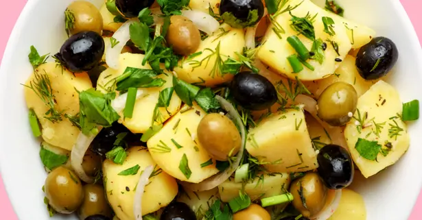 Едноставна, но многу вкусна комбинација. Варените компири се сечат на кругови и се мешаат со маслинки, кромид и прелив од маслиново масло, сенф и лимонов сок. Ова јадење е одлично како самостоен оброк или како прилог на друга посна трпеза.