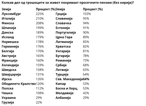 Анализата што ги споредува пензиите со трошоците за живот на крајот на октомври 2025 година покажува огромни разлики низ целиот континент. Односот се движи од само 22 проценти во Грузија до дури 225 проценти во Луксембург. Податоците за трошоците за живот, собрани од Numbeo, го претставуваат националниот просек за едно лице и не ја вклучуваат киријата, додека податоците за пензиите доаѓаат од анализа на Moorepay.