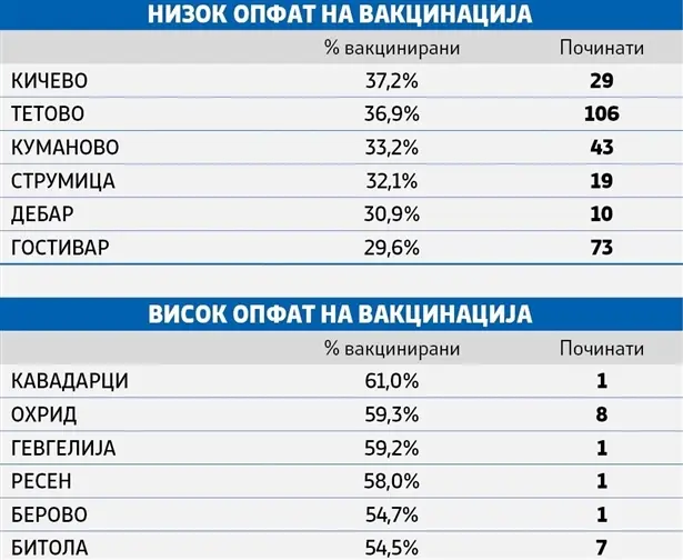 Во градовите како Гевгелија, Кавадарци, Ресен и Берово кадешто опфатот со вакцинација е помеѓу 54-61%, бројот на починати е најмал, односно има по еден починат. Тетово, го пречека бранот само со 19%   вакцинирани граѓани во јули, таму имаше најголем притисок врз болниците, најголем број хоспитализирани пациенти и најголем број смртни случаи, 106 до крај на август. Последните недели драстично е зголемен интересот за вакцинација во Тетово и изнесува скоро 37%. Слична е состојбата и во Гостивар каде исто така имаше мал опфат на вакцинирано население, во овој град опфатот на вакцинирани полнолетни граѓани до крај на август е под 30%, а бројот на починати со ковид е 73, пренесуваат од министерството.