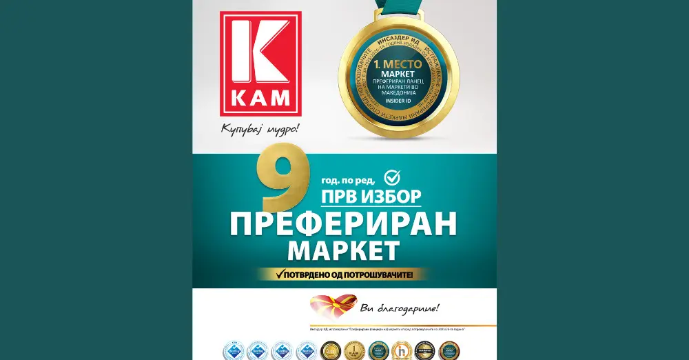 Се концентрираме на најважното - Ограничен асортиман - Едноставно пазарување - Бескомпромисен квалитет - Висококвалитетни приватни марки - Одговорно менаџирање - Формираме најдобри можни цени ИДНИ ПЛАНОВИ Експанзијата на КАМ во Македонија трае континуирано во последниве години, со што КАМ е еден од најголемите синџири на малопродажни продавници за храна и производи за широка потрошувачка во земјата. Планирано е натамошно проширување во следните години и, според бизнис-планот, планирано е да се отворат дополнителни 15 продавници во Северна Македонија и околу 40-50 нови продавници во Бугарија.