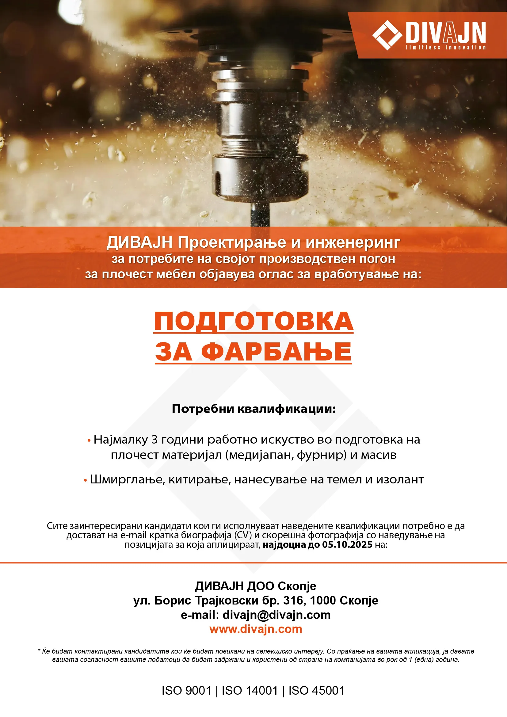 - Најмалку 3 години работно искуство во подготовка на плочест материјал (медијапан, фурнир) и масив