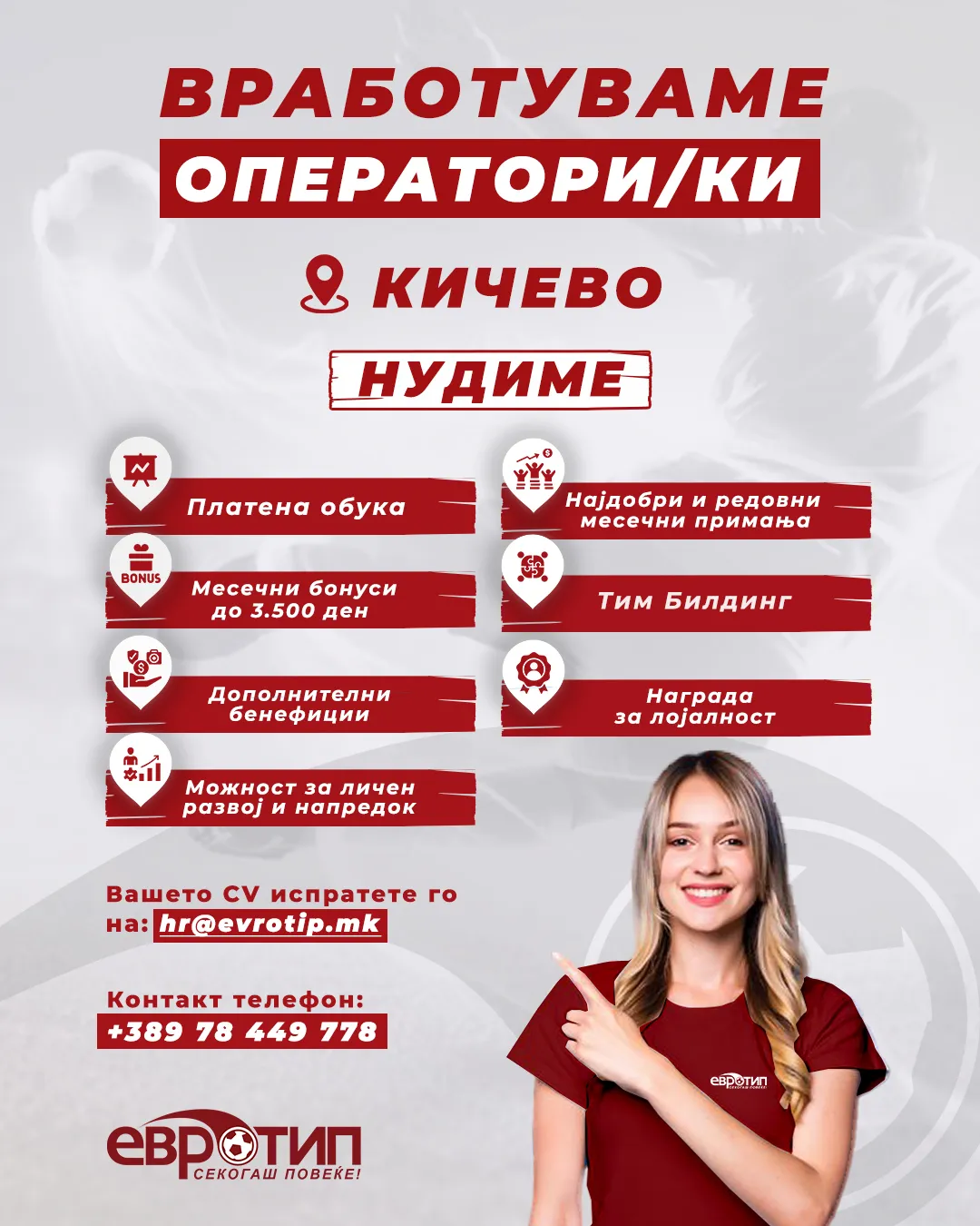 Поради зголемен обем на работа и отворање на нови уплатни локации, Евротип спортските обложувалници имаат потреба од оператори во Кичево.