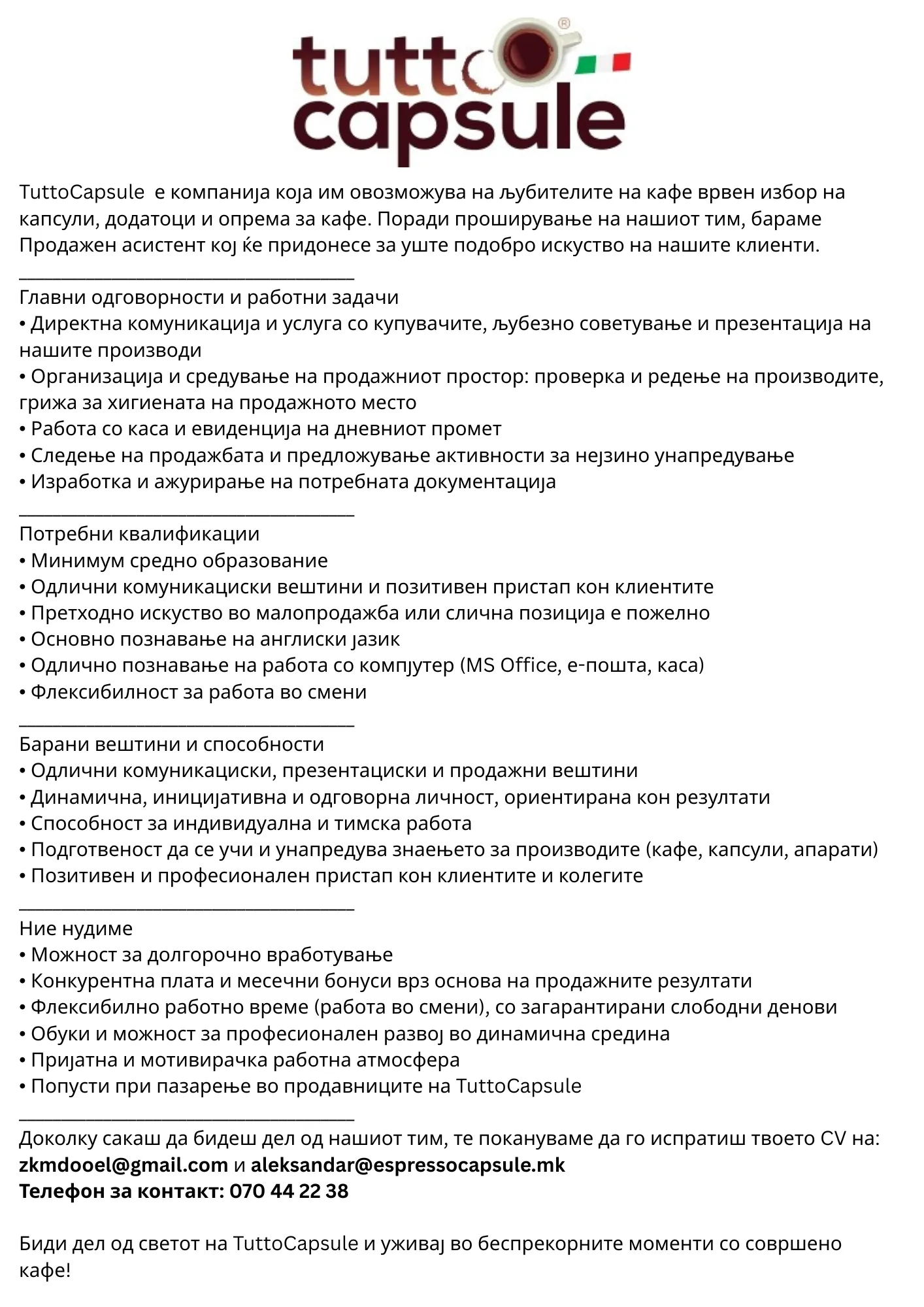 За компанијата: Tuttocapsule е место каде што можете да најдете одговор за вашиот вкус: стотици мешавини кафе од целиот свет, вешто обработени од најдобрите италијански печилници. Во нашите продавници ќе го најдете задоволството... повеќе за компанијата »