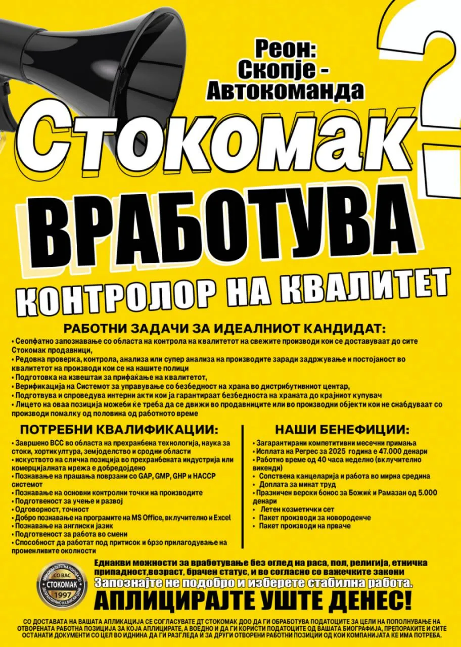 Продавач/ка - Касиер/ка - Млечен - Продавач/ка - Касиер/ка - Буњаковец - Продавач/ка - Касиер/ка - Мичурин - Продавач/ка - Касиер/ка - Аеродром - Продавач/ка-Касиер/ка - Илинден - Возач на камион