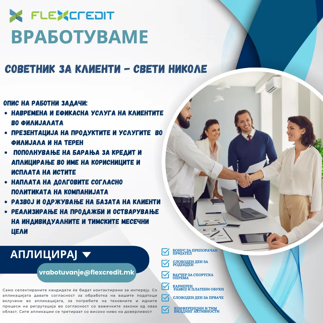 Флекс Кредит ДОО Скопје е Македонска небанкарска финансиска институција, регистрирана од Министерство за финансии на република Северна Македонија под број 13-1659/2.Компанијата обезбедува брзи потрошувачки... повеќе за компанијата »