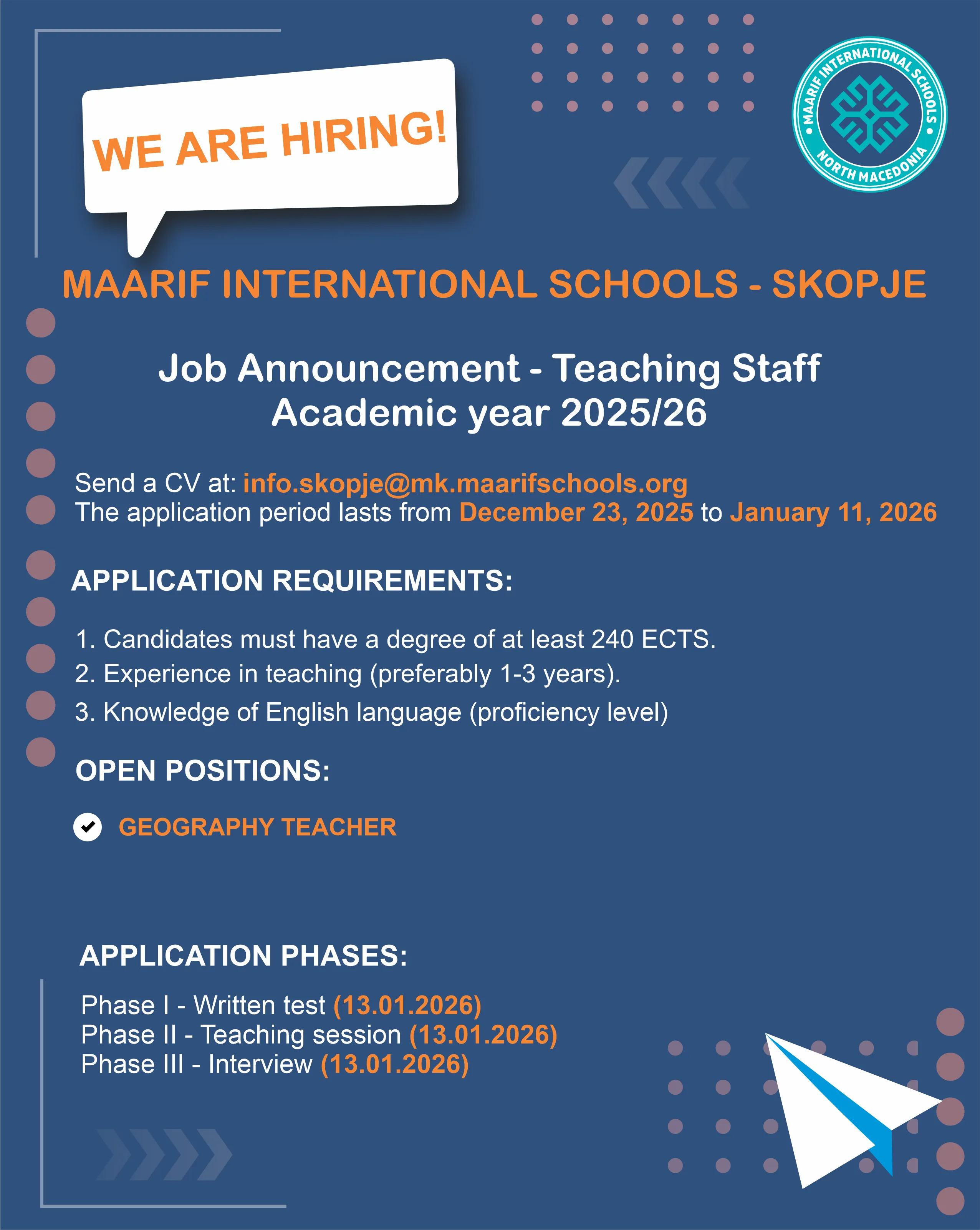За компанијата: The fundamental role of the teacher is to provide suitable ground for student learning and orientation. From this point of view, Turkish Maarif Foundation benefits, in educational activities, from competent... повеќе за компанијата »