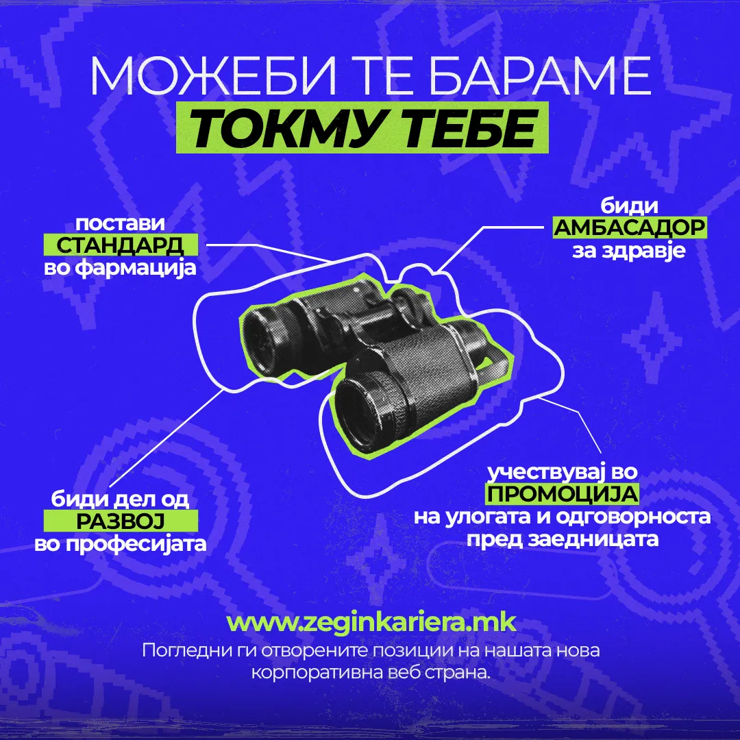 Здравјето и благосостојбата се симбол на препознатливост на нашата компанија, каде што со доверливост и грижа секој поединец го добива професионалниот пристап од нашите фармацевти и вработени со најдобрата палета на производи. Фокусот го насочуваме кон изборот на најсоодветни кандидати кои ќе се придружат на нашите постоечки успешни тимови. Гордо го носиме печатот за квалитет и стандард и со тоа придонесуваме кон поздрава и посреќна заедница, здрава младина и посреќна иднина!
