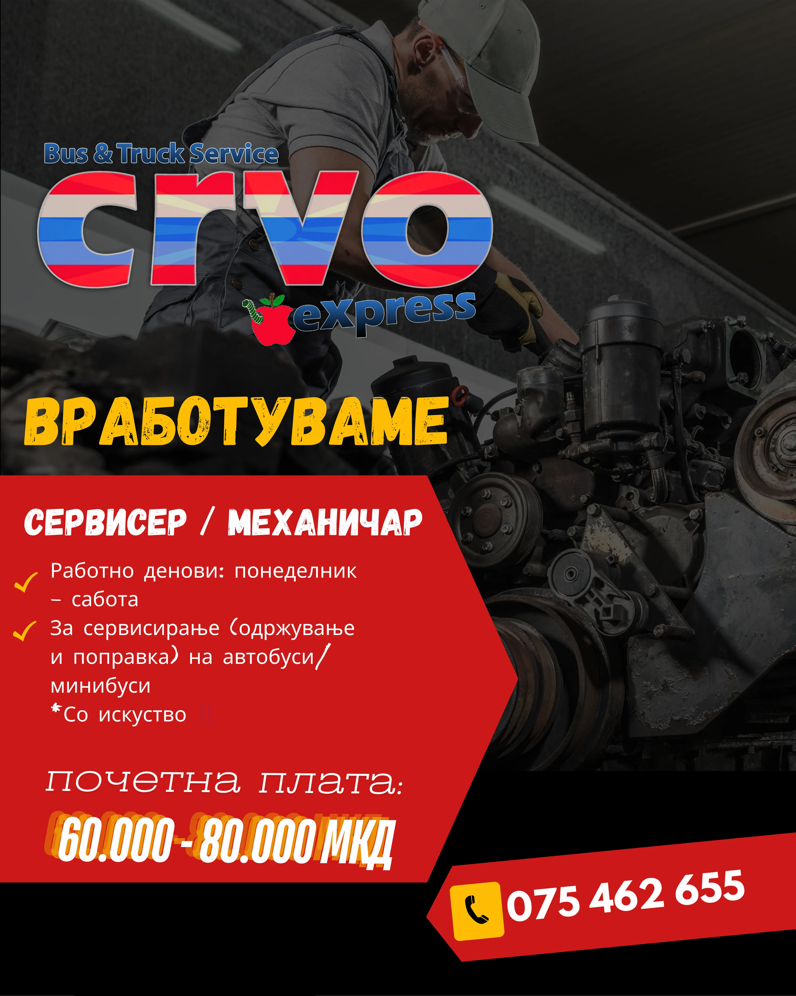 Вработуваме 3 ца сервисери / механичари за автобуси / минибуси / комбиња.