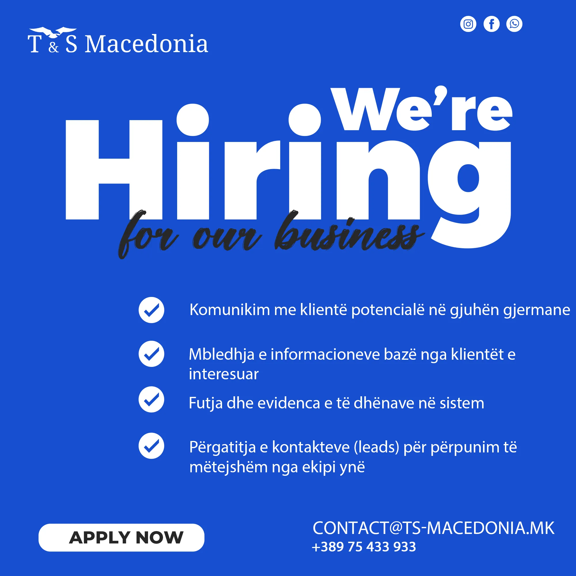 TS Macedonia po zgjeron ekipin e saj dhe ka nevojë për 5 persona komunikues dhe të motivuar që flasin gjermanisht (minimum niveli B1).