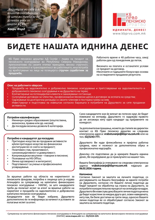 КБ Прво пензиско друштво произлезе од реформите во пензискиот систем во Република Северна Македонија и негова основна дејност е управување со пензиските фондови. Нашата цел е да создадеме вредност за... повеќе за компанијата »