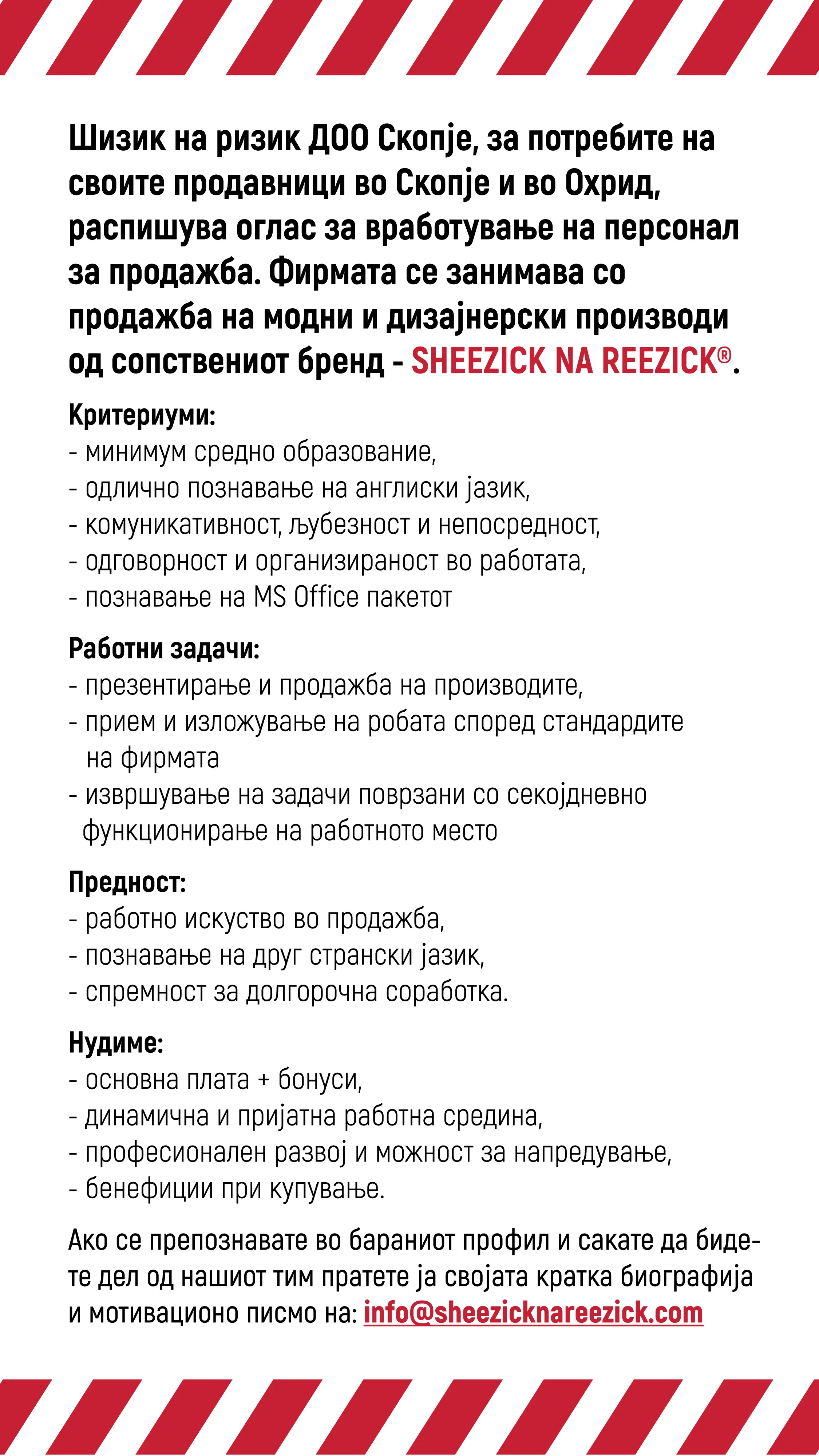 За компанијата: SHEEZICK NA REEZICK is a Skopje-based clothing brand made to inspire brave minds. We develop premium products with our values always in mind: connection to roots, unique design, passion and dedication. After... повеќе за компанијата »