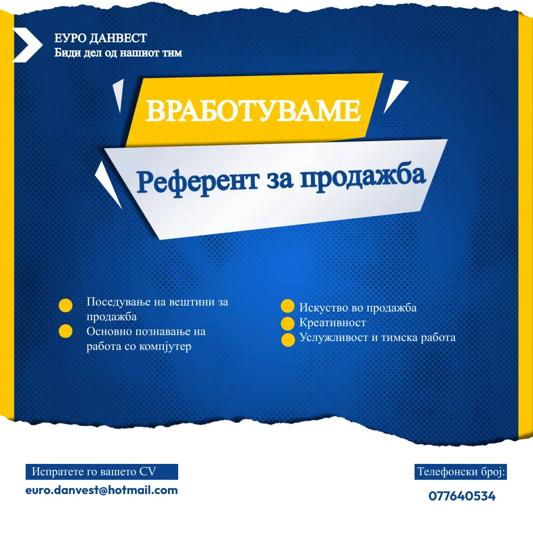 👉 Доколку сакате предизвик, креативна и убава атмосфера за работа, и сте комуникативни и тимски играчи, ве повикуваме да го испратите вашето професионално CV на: [најави се за да го видиш е-маилот]