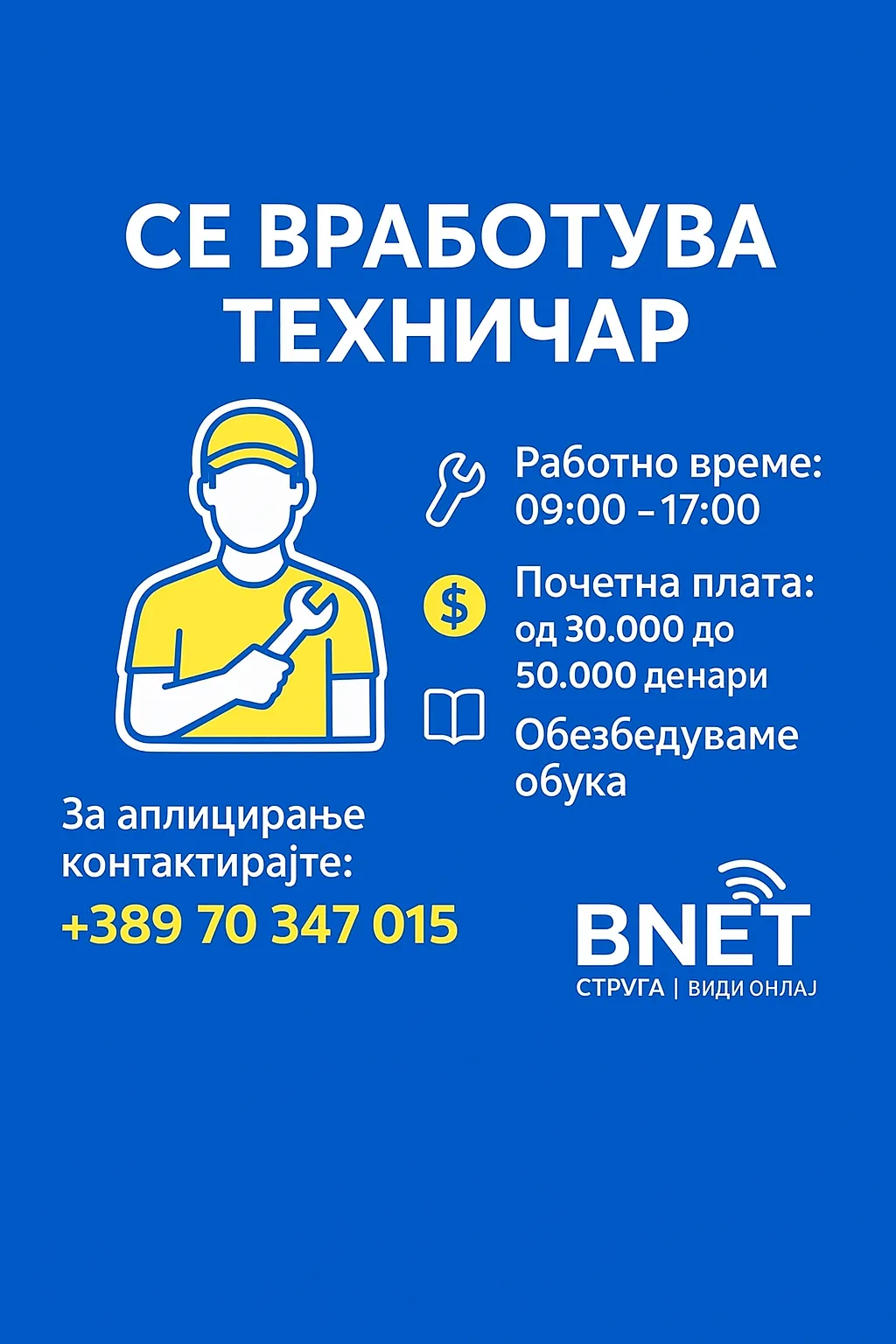 B-NET Dooel Struga имаа потреба од техничар за монтажа на интернет во регион Струга