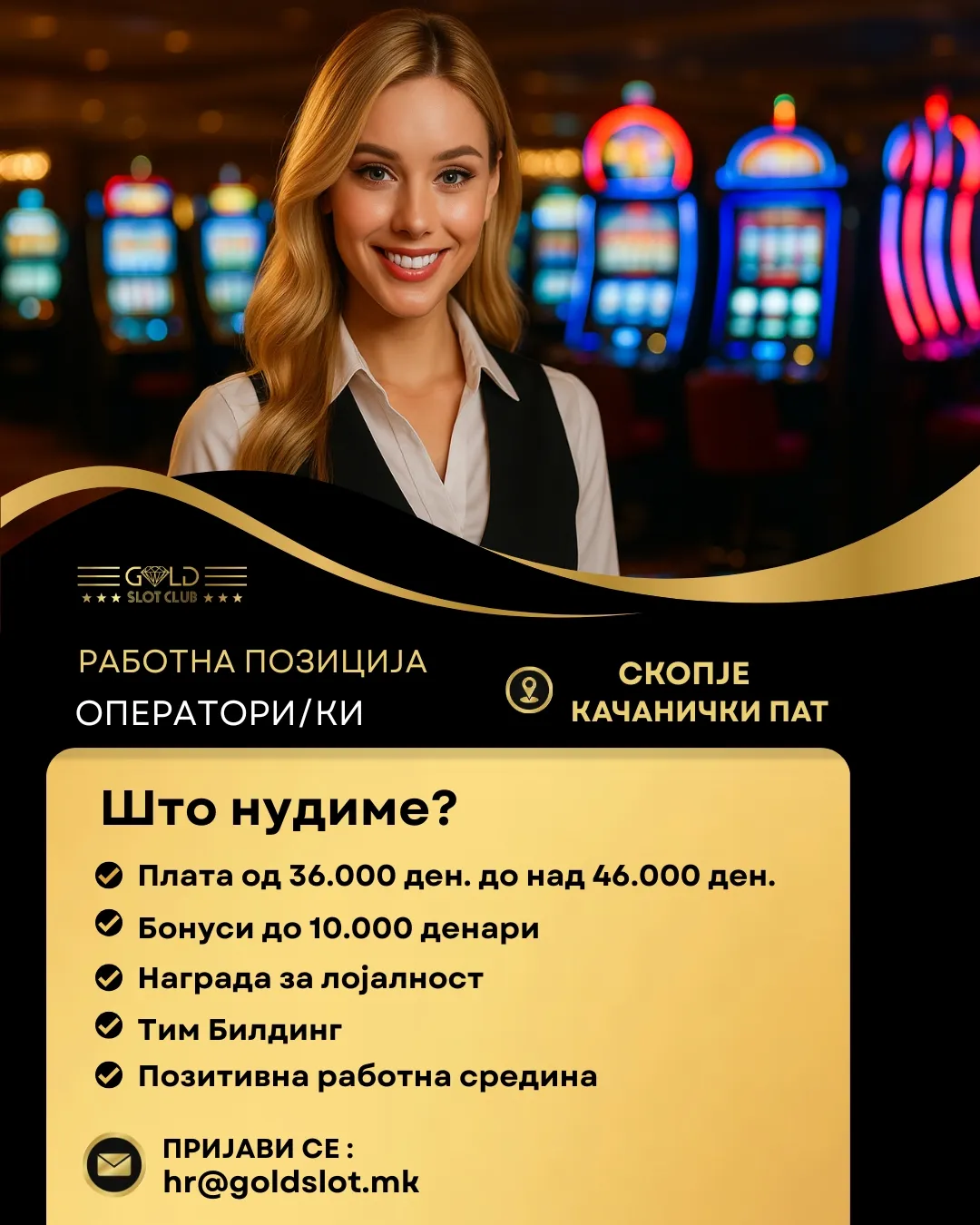 Голд Слот Клуб Скопје има потреба од професионални и динамични поединци да се приклучат на нашиот тим како оператори/ки!
