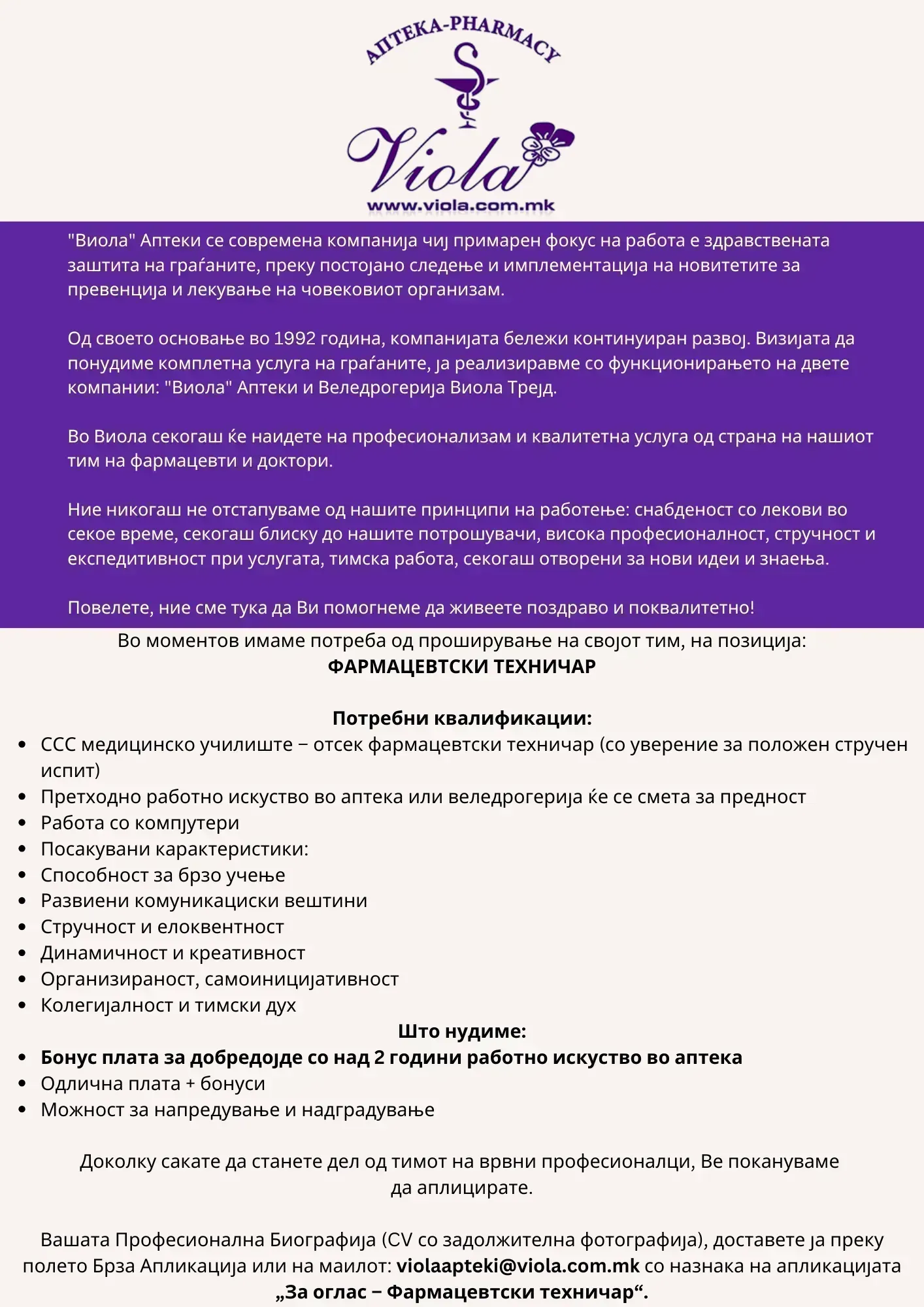 Активни огласи од ПЗУ Аптека ВИОЛА: