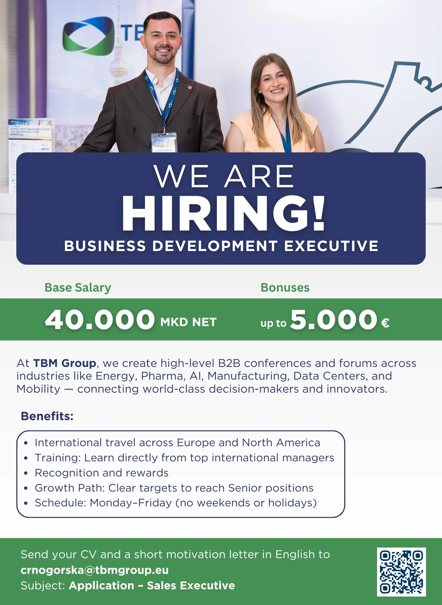 ТБМ Гроуп е меѓу водечките европски компании кои организираат тематски бизнис конференции. Како динамичен тим високо ги цениме различностите и новите таленти. Нашите тимови за бизнис развој се посветени... повеќе за компанијата »