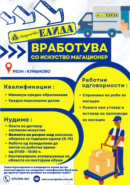 Елида Маркети е ланец на маркети во Куманово и Скопје. Во моментов имаме 29 маркети во Куманово и 4 маркети во Скопје, со повеќе од 300 вработени. Со маркети кои варираат просторно од 80 до 200 метри... повеќе за компанијата »