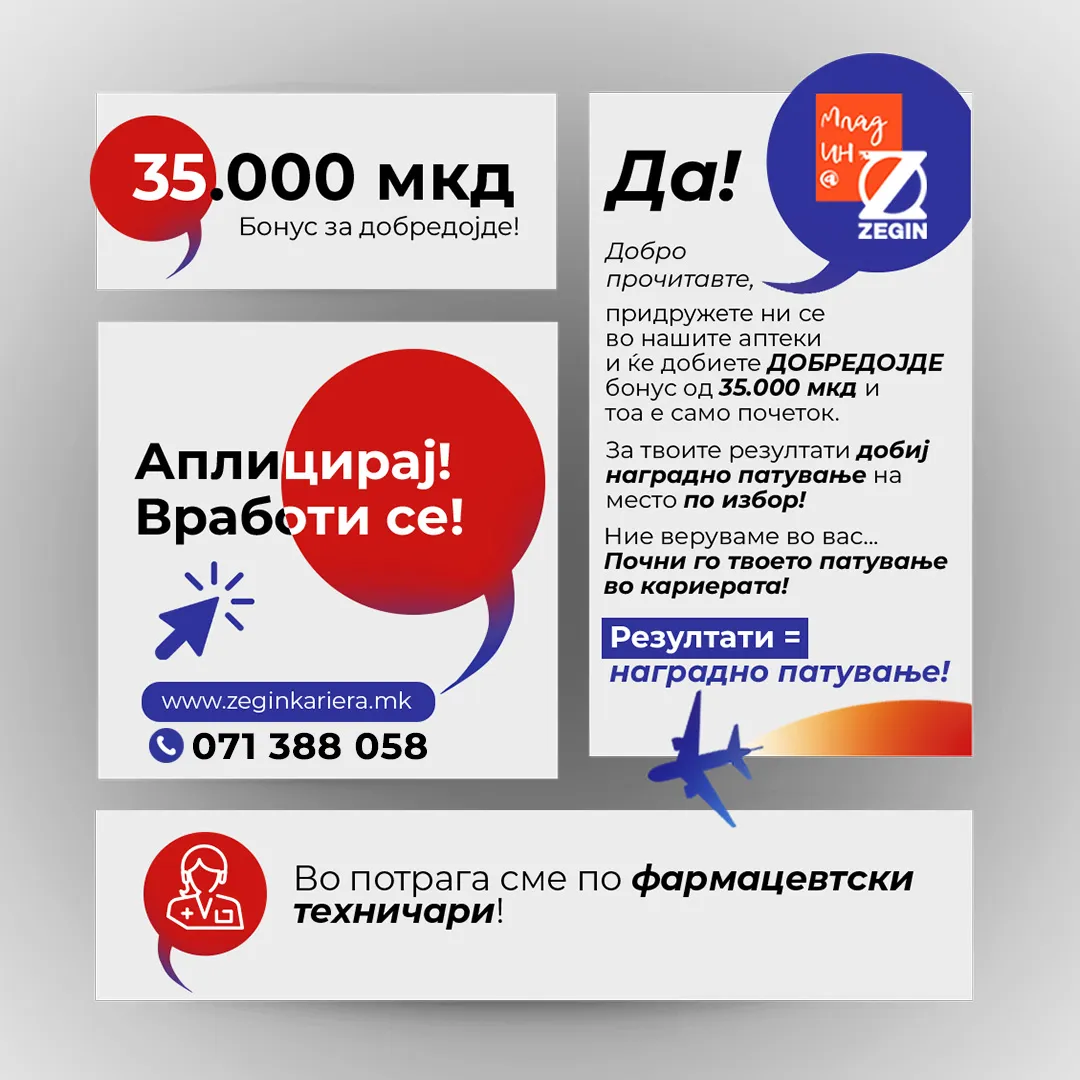 Здравјето и благосостојбата се симбол на препознатливост на нашата компанија, каде што со доверливост и грижа секој поединец го добива професионалниот пристап од нашите фармацевти и вработени со најдобрата палета на производи. Фокусот го насочуваме кон изборот на најсоодветни кандидати кои ќе се придружат на нашите постоечки успешни тимови. Гордо го носиме печатот за квалитет и стандард и со тоа придонесуваме кон поздрава и посреќна заедница, здрава младина и посреќна иднина!