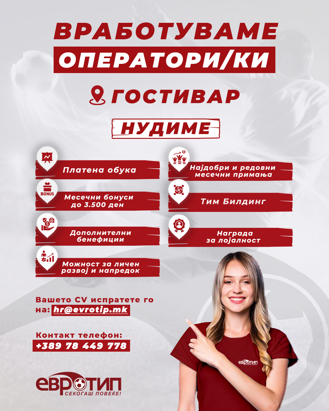 Поради зголемен обем на работа Евротип спортските обложувалници имаат потреба од оператори во Гостивар.