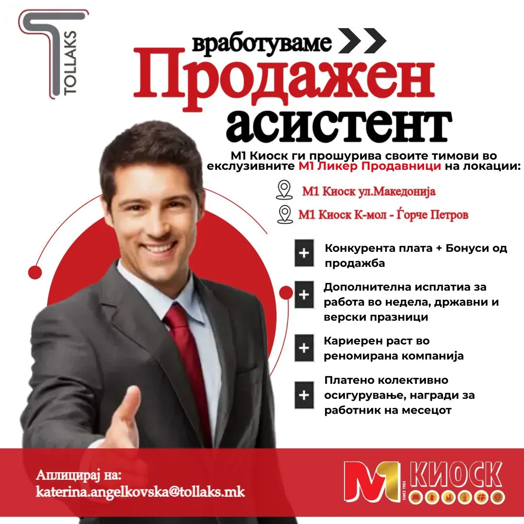 TОЛЛАКС ДОО Скопје, една од најуспешните малопродажни компании со 40 годишна традиција, сопственик на ланецот на 20 специјализирани продавници М1киоск, М1медиа, и Поло маркет, поради брз раст на компанијата... повеќе за компанијата »