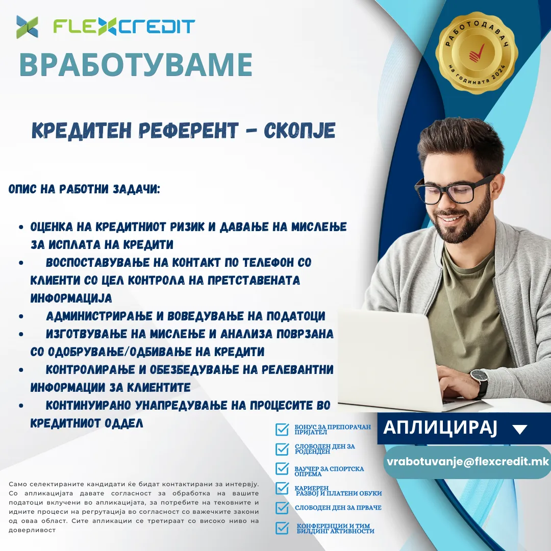 Флекс Кредит ДОО Скопје е Македонска небанкарска финансиска институција, регистрирана од Министерство за финансии на република Северна Македонија под број 13-1659/2.Компанијата обезбедува брзи потрошувачки... повеќе за компанијата »