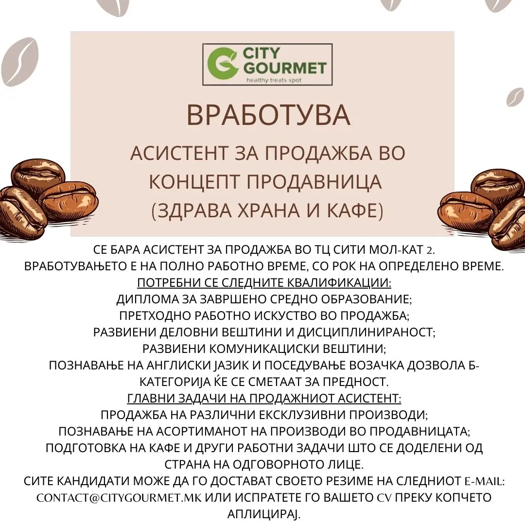 Активни огласи од СИТИ ГУРМЕТ ДООЕЛ Скопје: