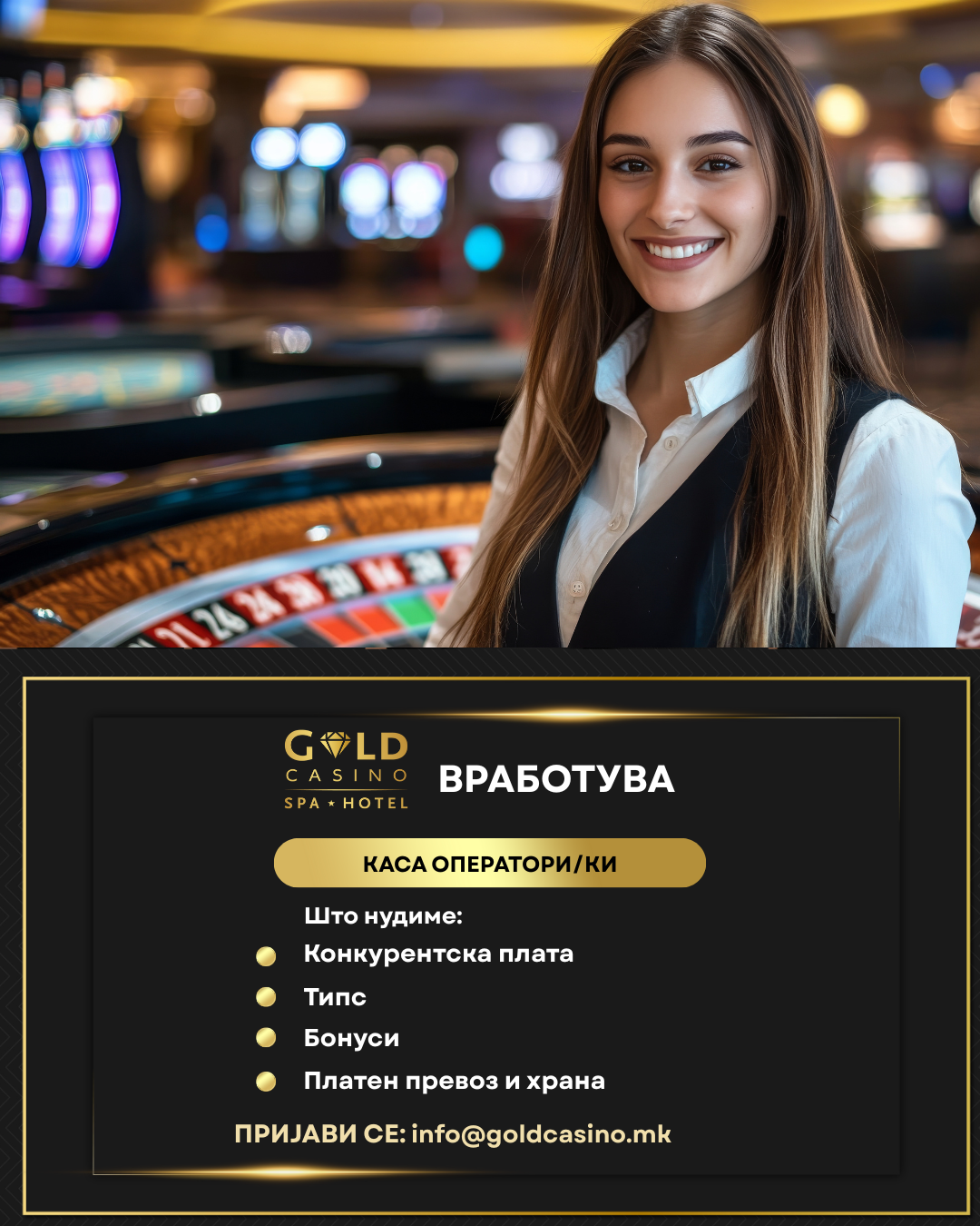 Луксузниот комплекс „Голд Казино“ во Тетово – со казино, хотел и спа – објавува оглас за вработување на Каса оператори.