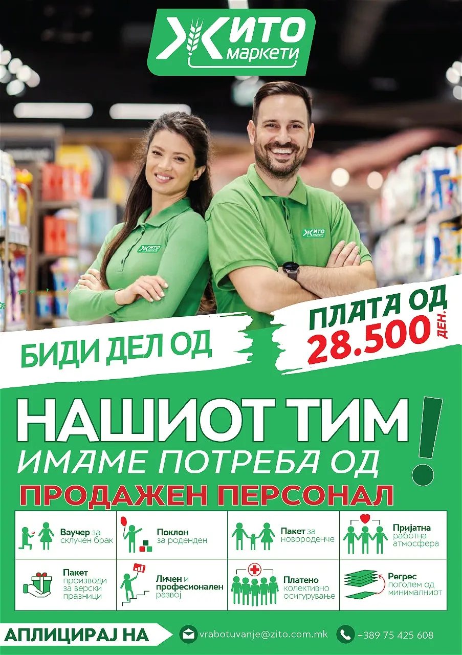 Заменик Раководител на Маркет - Аеродром - Продажен Персонал - Скопје нас.Аеродром - Продажен Персонал - Петровец - Продажен персонал - Кисела Вода - Продажен Персонал - Охрид - Комерцијалист - Референт во сектор за финансии - Специјалист за контролинг