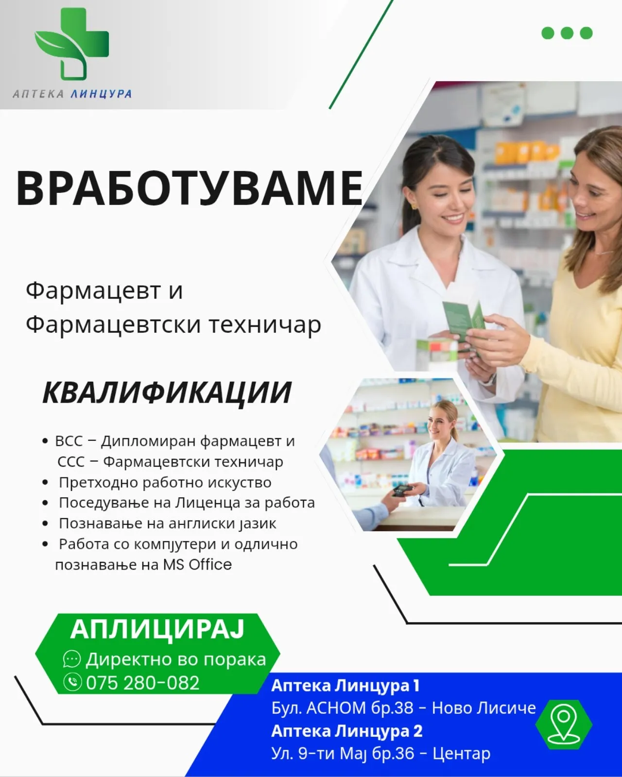 Бидете дел од тимот во Аптека Линцура 1, Ново Лисиче, Скопје. 19 години постоење.