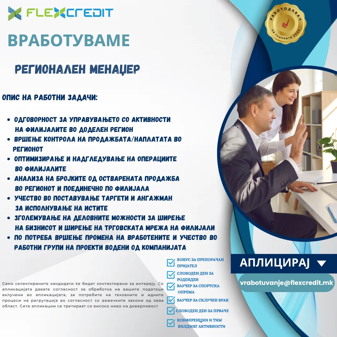 Флекс Кредит ДОО Скопје е Македонска небанкарска финансиска институција, регистрирана од Министерство за финансии на република Северна Македонија под број 13-1659/2.Компанијата обезбедува брзи потрошувачки... повеќе за компанијата »