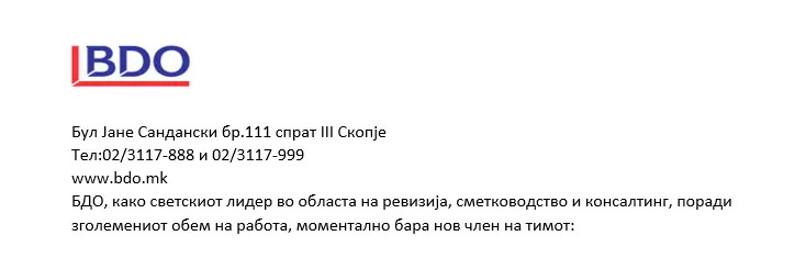 На: [најави се за да го видиш е-маилот] Со назнака: “БДО – Оглас за јуниор сметководител”.
