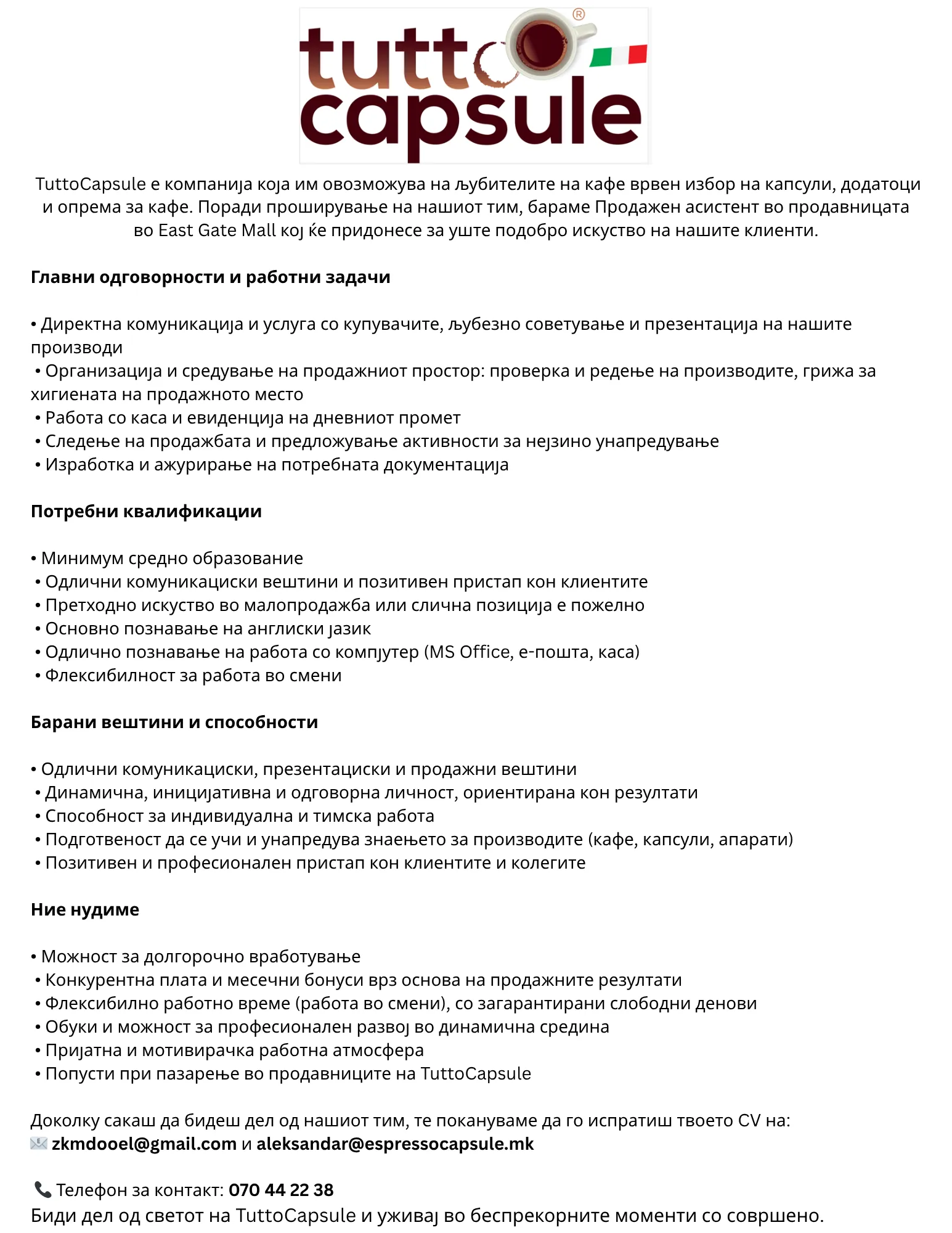 За компанијата: Tuttocapsule е место каде што можете да најдете одговор за вашиот вкус: стотици мешавини кафе од целиот свет, вешто обработени од најдобрите италијански печилници. Во нашите продавници ќе го најдете задоволството... повеќе за компанијата »