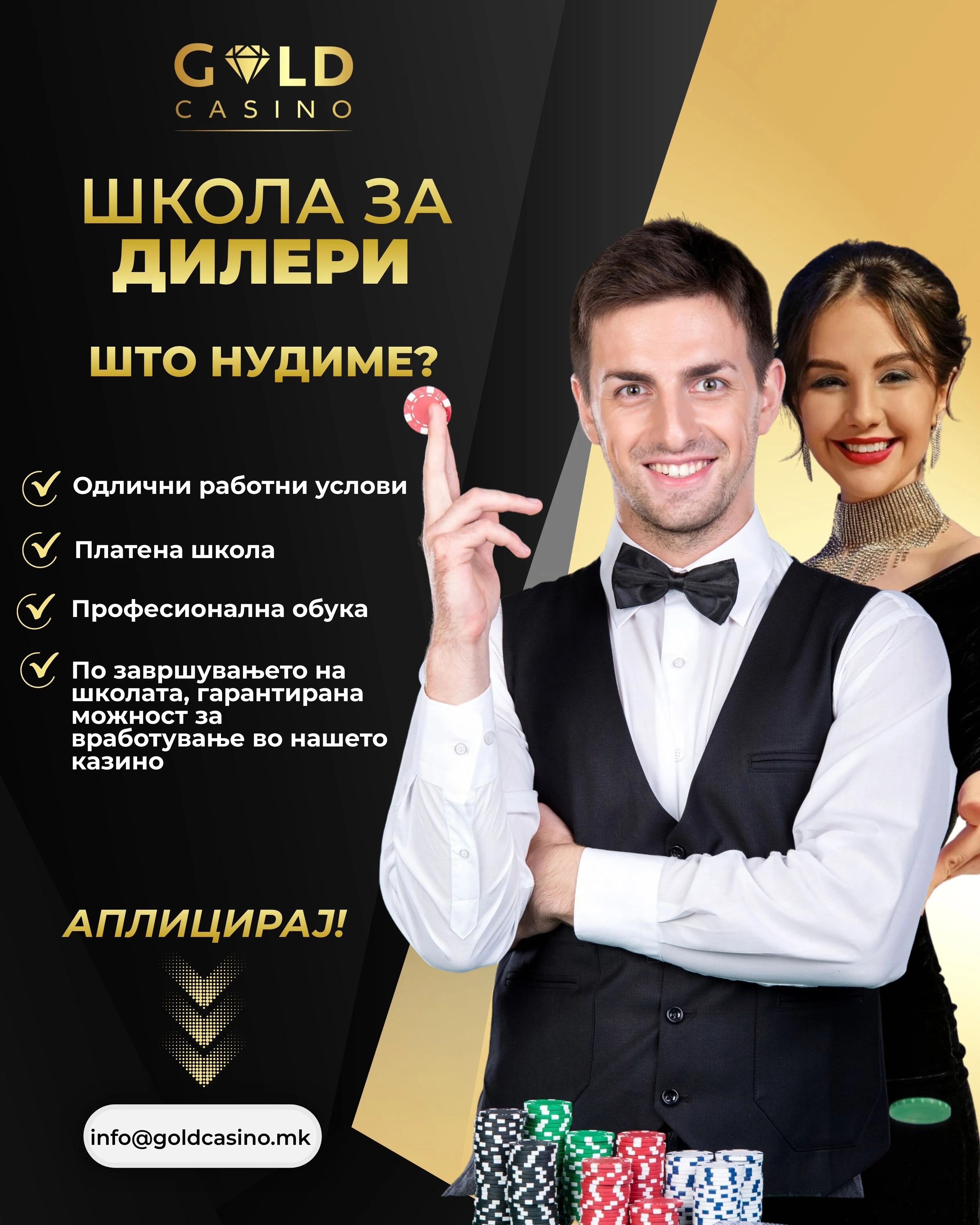 Новиот казино, спа и хотелски комплекс „Голд Казино“ во Тетово ги отвора вратите за сите амбициозни и енергични кандидати кои сакаат да станат дел од нашата Школа за дилери.