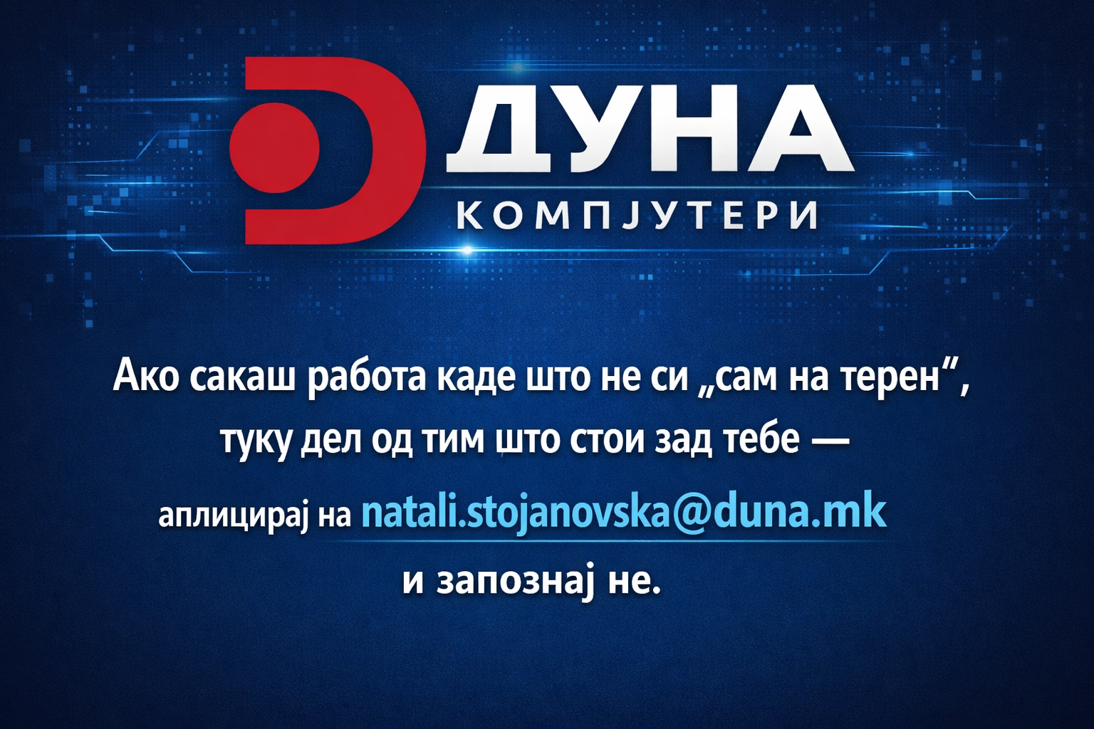 🤝 Ако сакаш работа каде што не си „сам на терен“, туку дел од тим што стои зад тебе – аплицирај на [најави се за да го видиш е-маилот] и запознај нè.