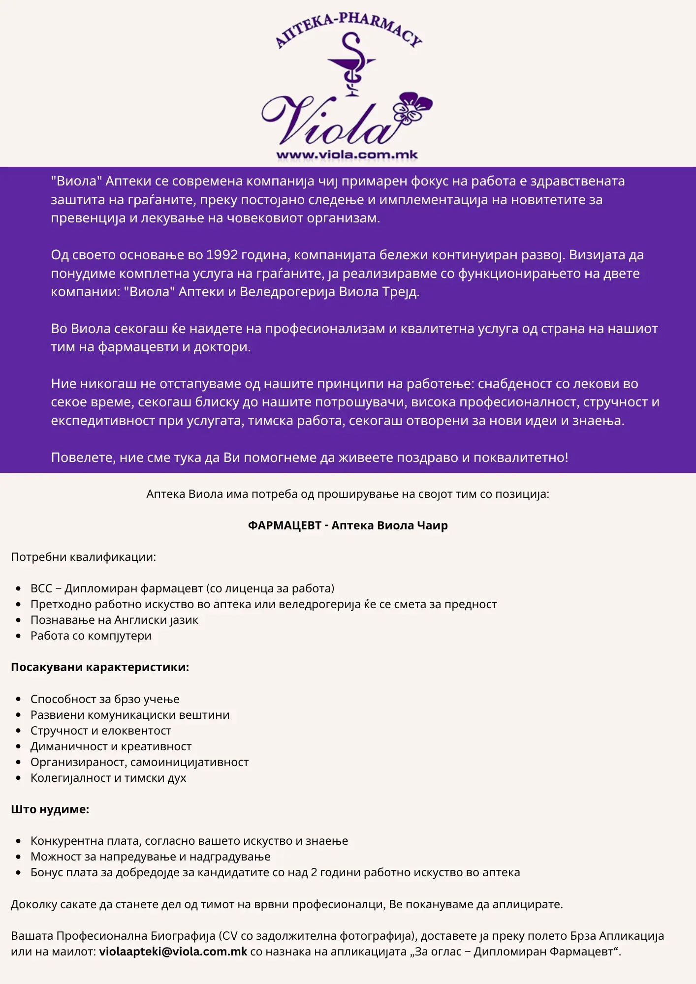 Виола Аптеки се современа компанија чиј примарен фокус на работа е здравствената заштита на граѓаните.
