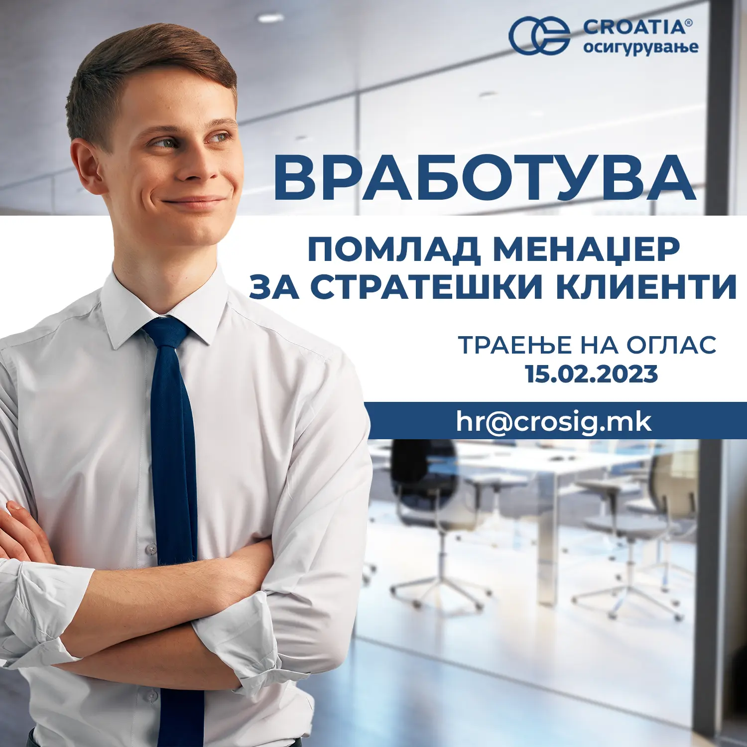 Ве охрабруваме Вашата кратка професионална биграфија да ни ја испратите најдоцна до 15.02.2023г. на следната mail адреса: hr@crosig.mk со назнака: АПЛИКАЦИЈА ЗА ПОМЛАД МЕНАЏЕР ЗА СТРАТЕШКИ КЛИЕНТИ