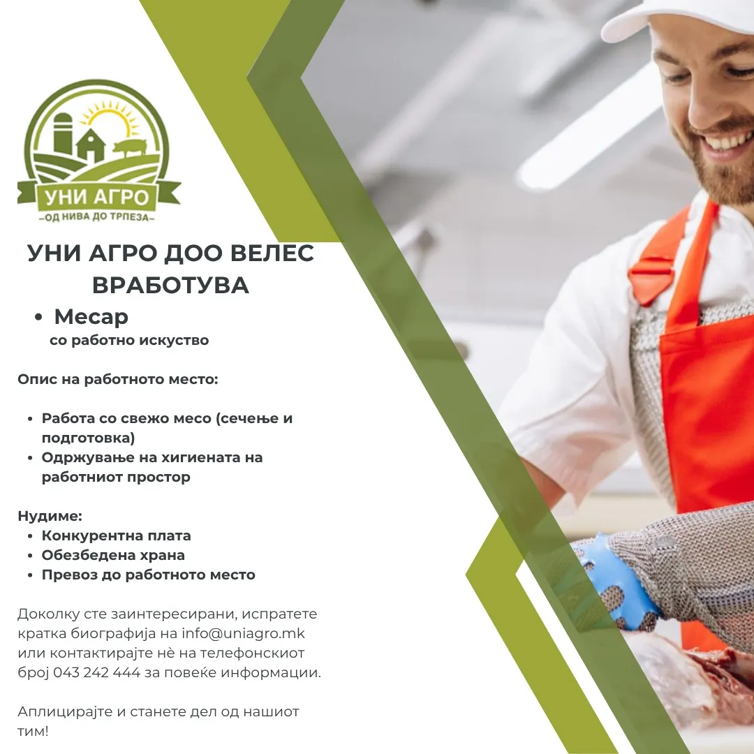 За компанијата: УНИ АГРО ДОО е компанија која со посветеност и одговорност работи во областа на земјоделството и сточарството. Нашата работа опфаќа производство и промет на семенски материјали, житарици, мешана сточна...