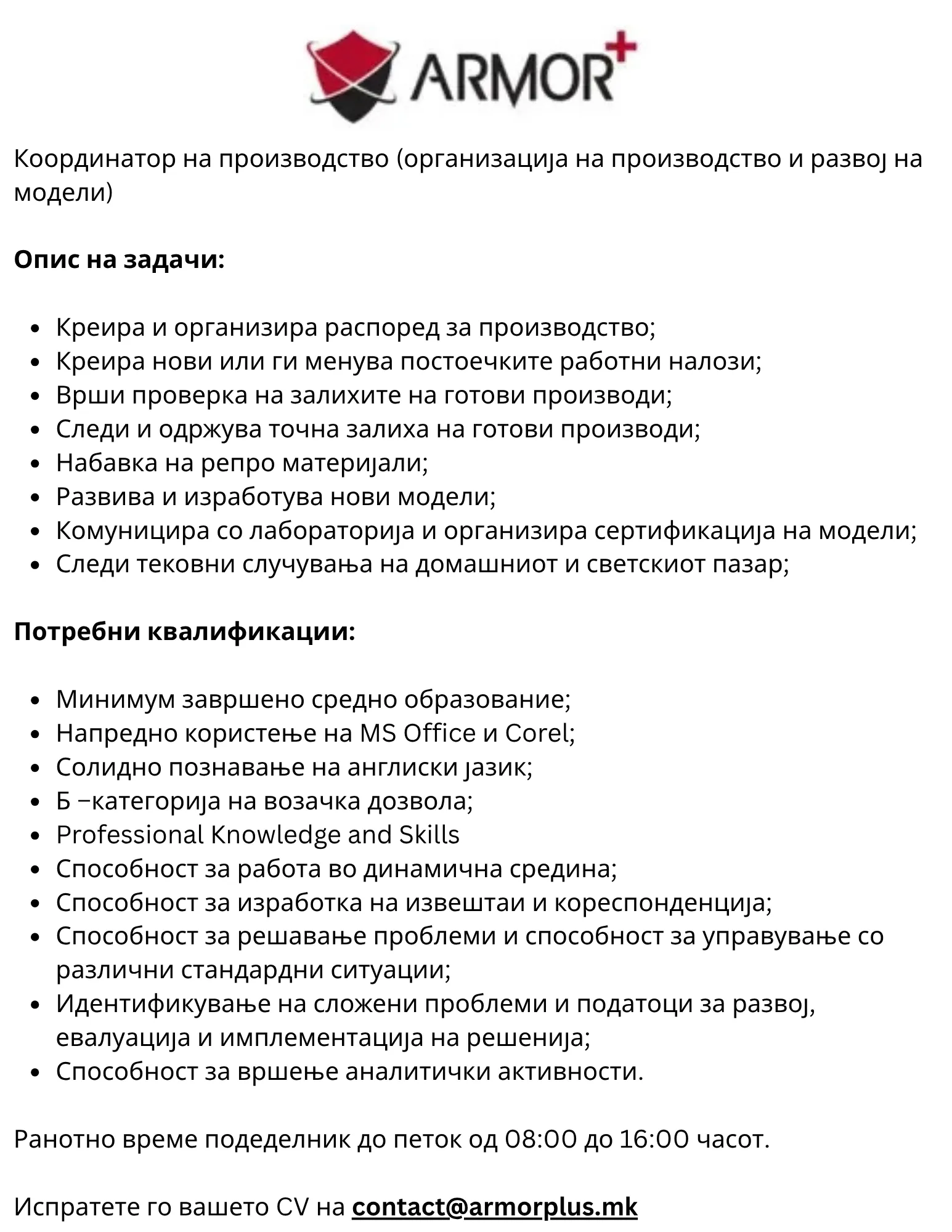 Компанијата АРМОР ПЛУС е основана 2002 година во Скопје управувана од тим која со своите иновативни и креативни решенија стана еден од водечките специјалисти за работна облека и опрема за лична заштита.... повеќе за компанијата »