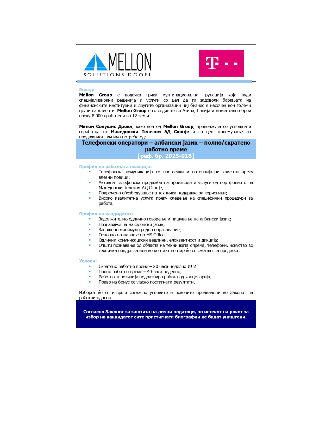 Mellon Solutions Dooel дел од Mellon Групацијата, е основана во Скопје во 2003 година и претставува двигател на дигиталната модернизација во финансискиот сектор. Компанијата обезбедува напредни решенија... повеќе за компанијата »