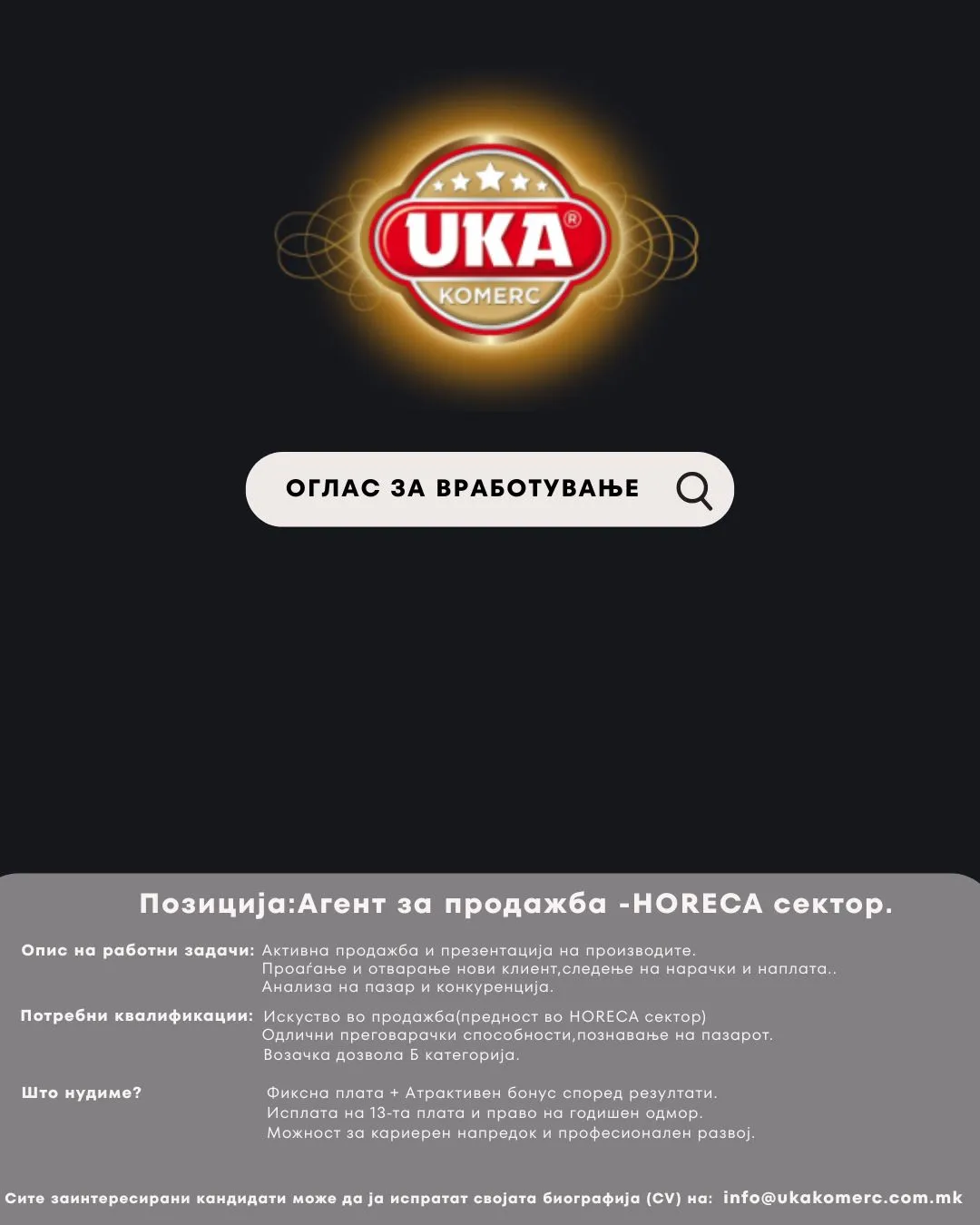 УКА КОМЕРЦ ДООЕЛ, е семејна компанија за производство на месни производи, основана во 1991 година. Фабриката се наоѓа во еколошка зона во Сарај-Скопје.Компанијата произведува широк спектар на деликатесни производи според меѓународните стандарди за квалитет и безбедност на храната.