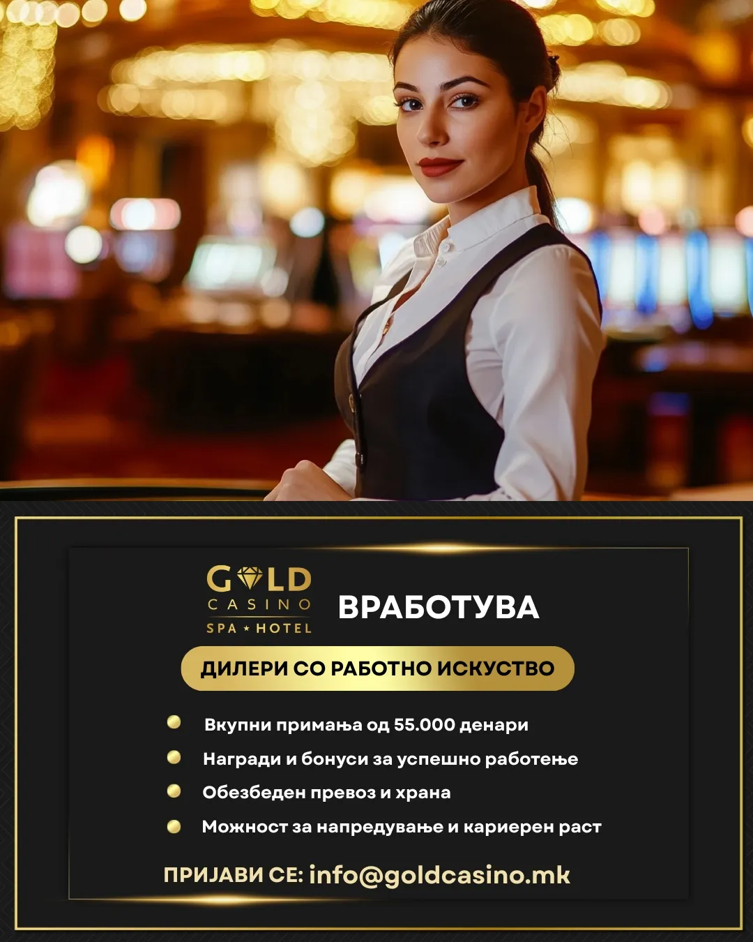 Новиот луксузен комплекс „Голд Казино“ во Тетово – со казино, спа и хотел – има потреба од Дилери со работно искуство кои сакаат да станат дел од професионален и амбициозен тим.