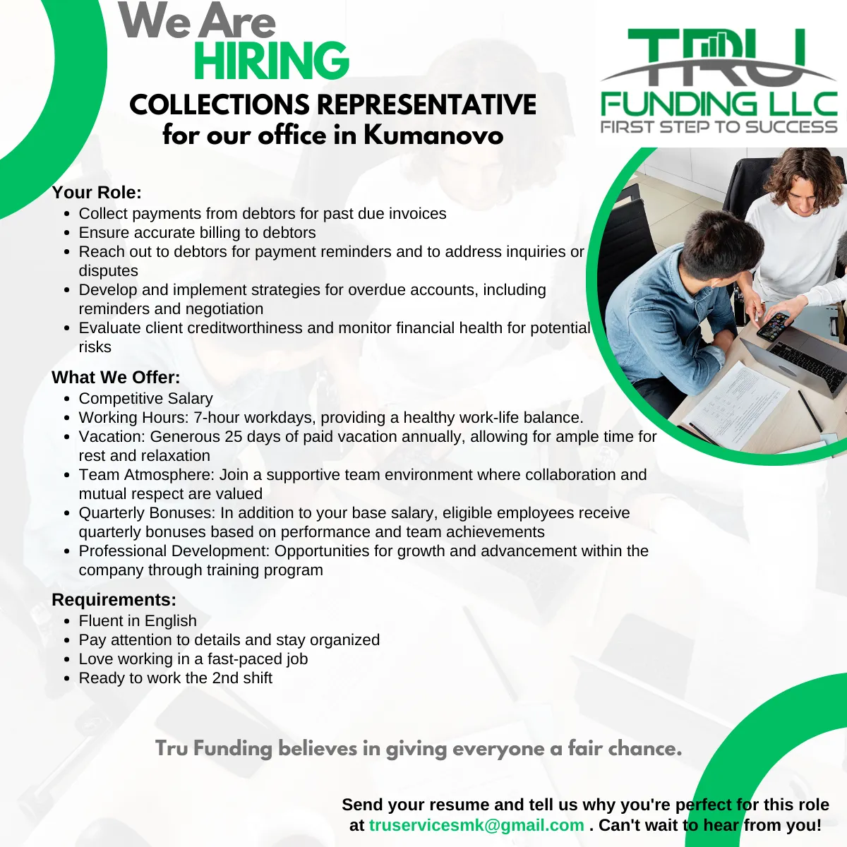 За компанијата: Are you looking for an exciting career in finance? Tru International Services is a part of Tru Funding LLC factoring company based in Chicago IL, it is a fast-paced, high-growth industry that helps businesses... повеќе за компанијата »