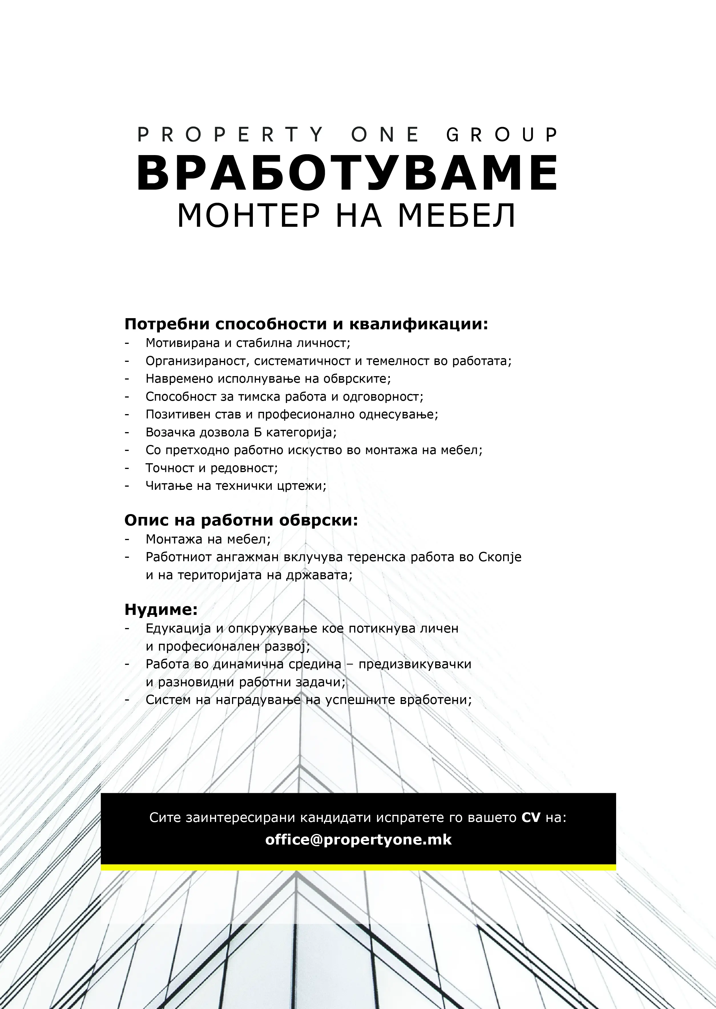 Property One Real Estate and Development е иновативна агенција за недвижности, co-work хаб, конслатинг агенција и компанија која ќе ви помогне не само да го пронајдете вашиот идеален имот но и да го... повеќе за компанијата »
