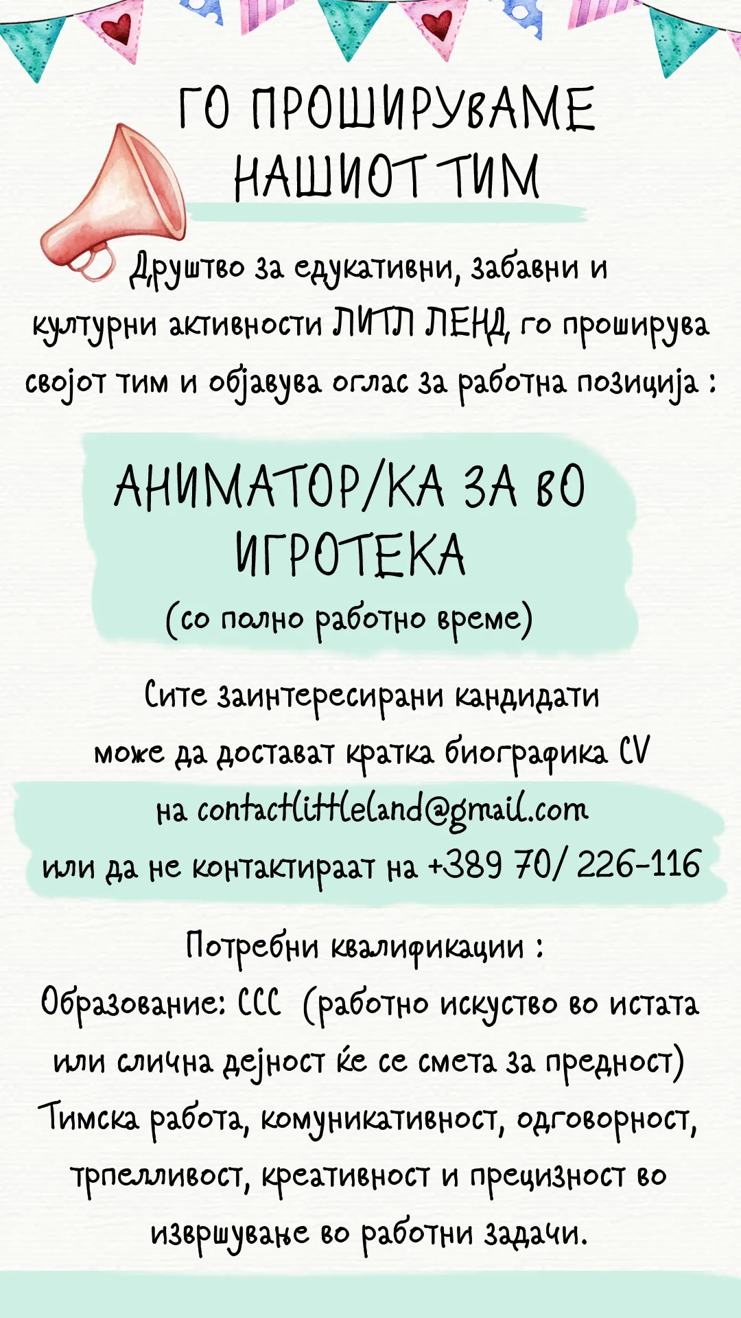 Друштво за едукативни, забавни и културни активности ЛИТЛ ЛЕНД го проширува својот тим и објавува оглас за 2 (две) работна позиција:
