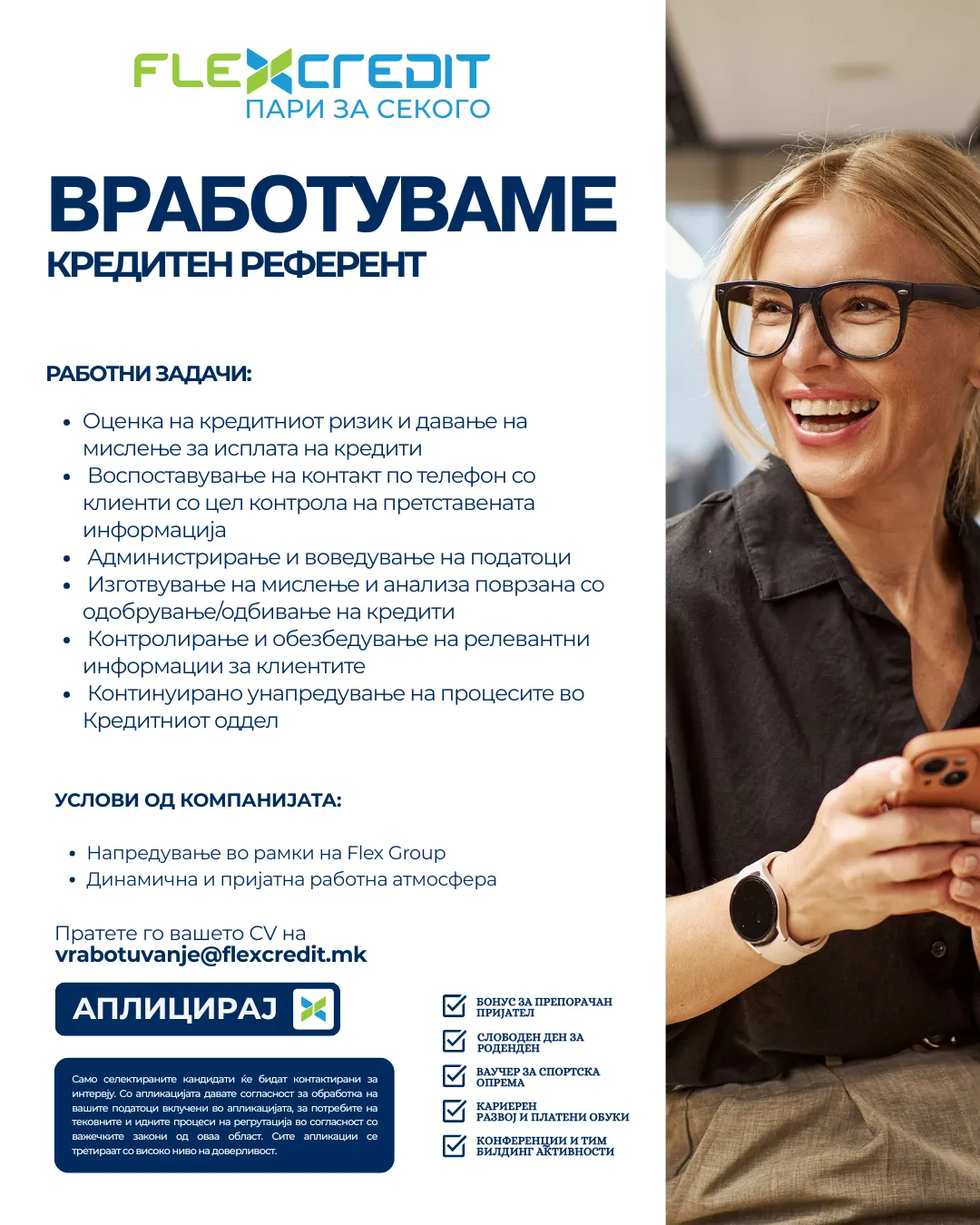 Флекс Кредит ДОО Скопје е Македонска небанкарска финансиска институција, регистрирана од Министерство за финансии на република Северна Македонија под број 13-1659/2.Компанијата обезбедува брзи потрошувачки... повеќе за компанијата »
