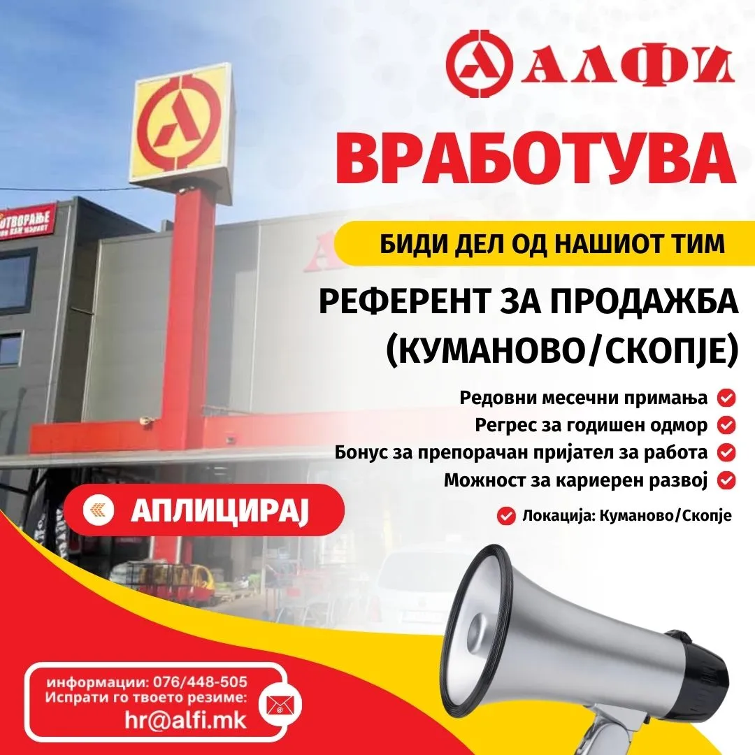 Вашето резиме (CV) доставете ни го на [најави се за да го видиш е-маилот] , со ознака „Персонал за продажба (Скопје) или (Куманово)“
